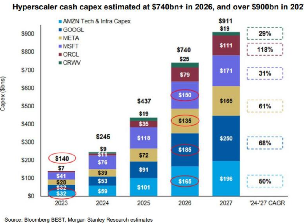 真正引发市场震动的,并不是单家公司“多花了钱”,而是整个超大规模云厂商体系的资本开支同时失控。这不是一次普通的资本支出上调,而是一次结构性跃迁。