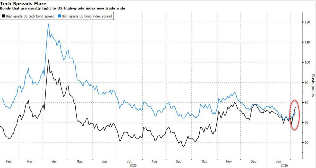 “大型科技公司正准备在人工智能上的支出远高于投资者此前预期,而无论结果如何,资金管理人越来越担心信用市场将受到冲击。”