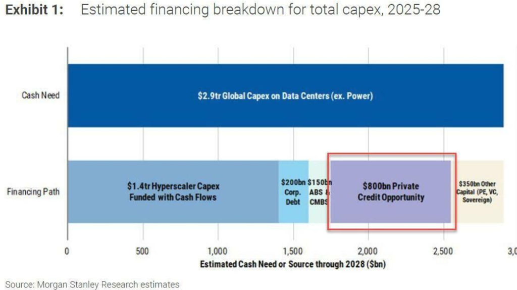 根据测算,全球数据中心在2028年之前所需的资本开支约为2.9万亿美元(这一数字还在增加)。而企业自身的运营现金流只能通过资本开支覆盖其中的一半。